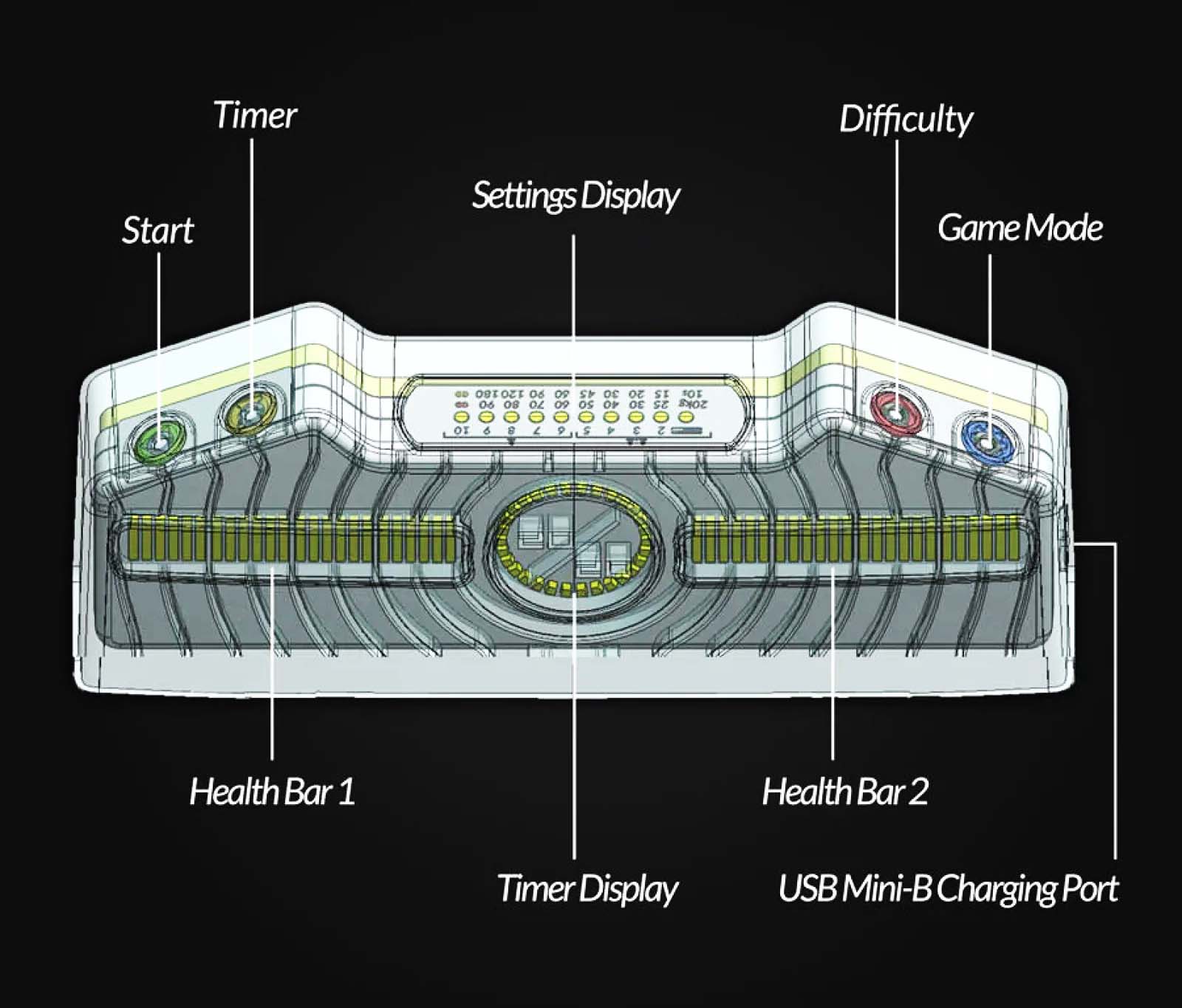 - LIGHTING ELEMENTS: Timer Display, Health Bars for Players 1 and 2, Settings Display panel. 4 Built-in Controls: Game Mode, Sensitivity, Timer, Start